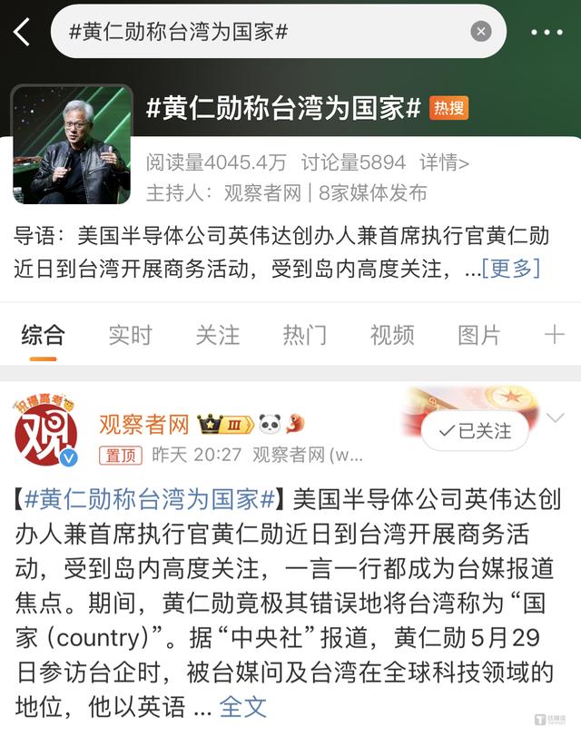 6月6日晚,#黃仁勛稱臺(tái)灣為國(guó)家#詞條一度登上微博熱搜,引發(fā)關(guān)注。