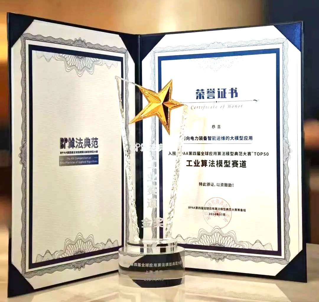 大會期間,集團公司所屬研究院數(shù)智化技術中心與所屬許繼電氣軟件公司人工智能研發(fā)部組成聯(lián)合團隊,參加大會品牌賽事“BPAA第四屆全球應用算法模型典范大賽”,充分展示了大模型在輸變電裝備領域的創(chuàng)新應用成果。團隊經(jīng)過初賽、賽道賽、總決賽的層層角逐,從近300支參賽隊伍中脫穎而出,成功入圍TOP50榜單并晉級總決賽,最終斬獲工業(yè)算法賽道金獎。