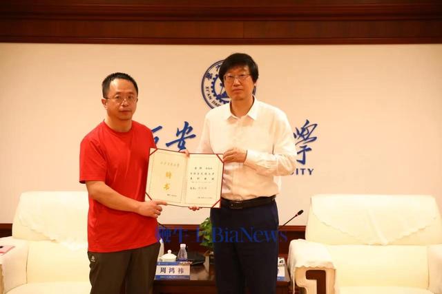 在周鴻祎校友兼職教授授聘儀式上,西安交大校長張立群為周鴻祎頒發(fā)了聘書,并為他佩戴?;?。