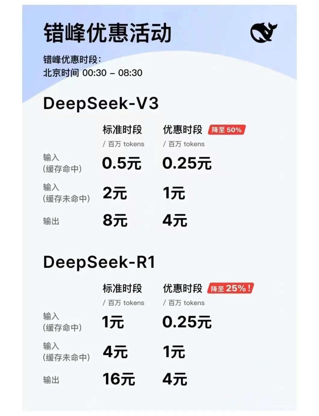 據(jù)了解,DeepSeek主要有兩款主力模型DeepSeek-chat(基礎(chǔ)大模型,對(duì)應(yīng)V3)和DeepSeek-reasoner(推理模型,對(duì)應(yīng)R1)。在標(biāo)準(zhǔn)時(shí)段(北京時(shí)間08:30—00:30),V3和R1的百萬(wàn)tokens輸入(緩存命中)價(jià)格分別為0.5元和1元,百萬(wàn)tokens輸出分別為8元和16元。而在優(yōu)惠時(shí)段(北京時(shí)間00:30—08:30),V3和R1的百萬(wàn)tokens輸入(緩存命中)則均降為0.25元,百萬(wàn)tokens輸出均降為4元。