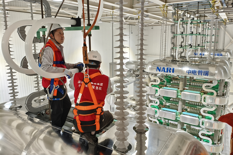 ▲國網(wǎng)電科院(南瑞集團(tuán))員工在渝北換流站開展雙極低端換流閥帶電前專項(xiàng)檢查