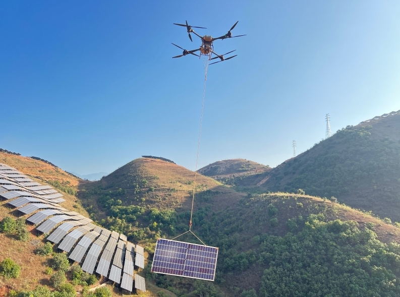 位于河北井陘、云南伍寨等大型山地的光伏項目,無人機化身“空中運輸奇兵”。它們緊貼近乎垂直的巖壁,將重達20公斤的光伏支架配件精準(zhǔn)投送至半山腰作業(yè)點,以“穿針引線”般的靈巧,徹底破解了山地物流困局。