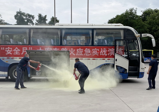 在演練時,隨著滿載乘客的大客車行駛至劉電賓館門前,突然行李艙起火,大客車駕駛員在突然遇火險緊急情況下,立即開啟應(yīng)急雙閃燈,靠邊停車,打開車門,迅速引導(dǎo)車內(nèi)乘客有序疏散,并要求大家用濕毛巾捂住口鼻,彎腰依次撤離到車外安全地帶。緊接著滅火組演練人員迅速行動起來,熟練地取出車載滅火器,拔下滅火器安全銷,用噴口對準(zhǔn)火源根部,及時將火撲滅,救護組及時疏散和救援下車人員,并對傷員身體狀況進行基本護理和檢查。整個演練過程既緊張,又有條不紊,進一步增強了全體員工的安全意識,真正掌握了交通工具突發(fā)火險后迅速逃生、自救、互救的基本方法,達到了演練的預(yù)期目的。