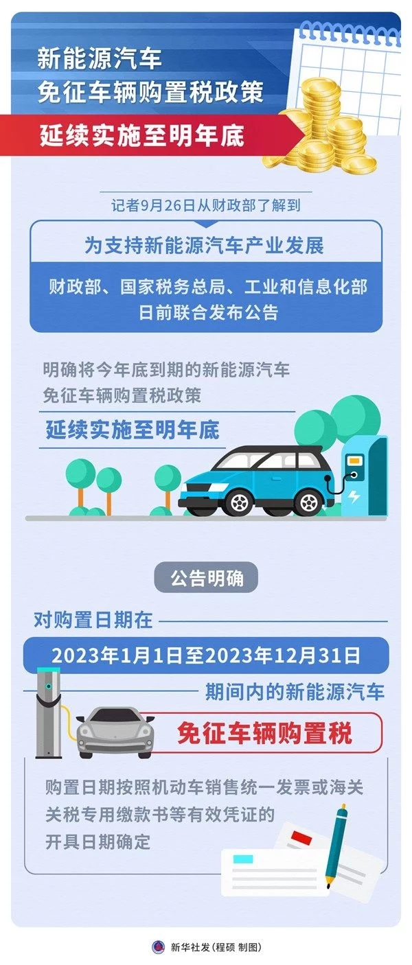 新華社北京9月26日電(記者申鋮)記者26日從財政部了解到,為支持新能源汽車產業(yè)發(fā)展,財政部、國家稅務總局、工業(yè)和信息化部日前聯(lián)合發(fā)布公告,明確將今年底到期的新能源汽車免征車輛購置稅政策,延續(xù)實施至明年底。