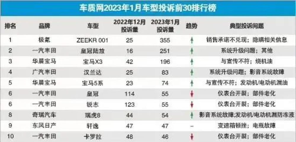 但另一方面,根據(jù)車質(zhì)網(wǎng)公布的2023年1月車型投訴排行榜,極氪001在1月份以355單的投訴量“榮登榜首”,登榜原因主要集中在銷售欺詐、承諾不兌現(xiàn)以及新車座椅鼓包等問題,極氪如果想要在汽車市場上走得更遠(yuǎn),這個售前售后的問題及時給消費者解決。