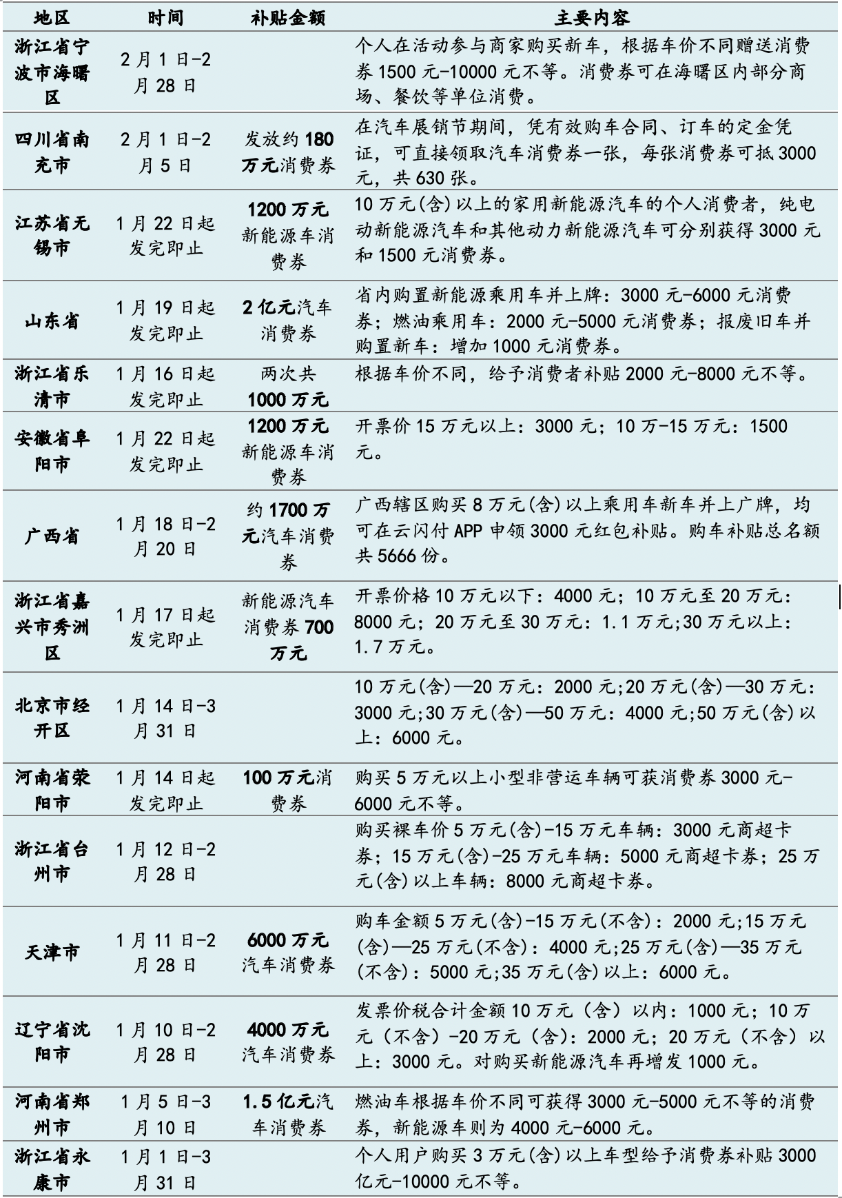 1月16日,浙江省樂(lè)清市發(fā)布迎春促消費(fèi)活動(dòng),發(fā)放300萬(wàn)元汽車(chē)消費(fèi)券,2月1日,樂(lè)清市再度延續(xù)該活動(dòng),增加發(fā)放700萬(wàn)元汽車(chē)消費(fèi)券,根據(jù)車(chē)價(jià)不同,給予消費(fèi)者補(bǔ)貼2000元-8000元不等。
