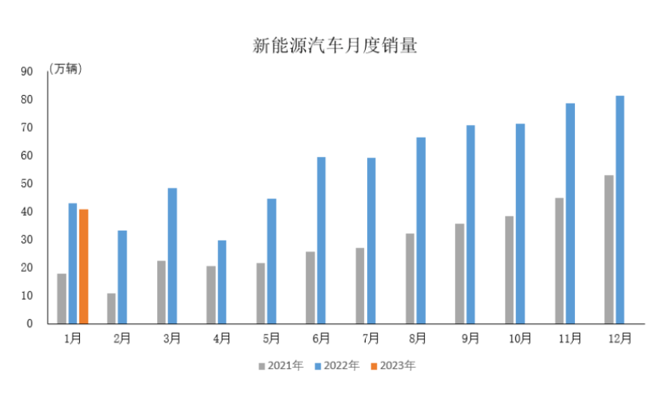 2023年1月,新能源汽車產(chǎn)銷分別完成42.5萬輛和40.8萬輛,環(huán)比分別下降46.6%和49.9%,同比分別下降6.9%和6.3%,市場占有率達到24.7%。與2022年春節(jié)月(2月份)相比,產(chǎn)銷分別增長15.4%和22.2%。