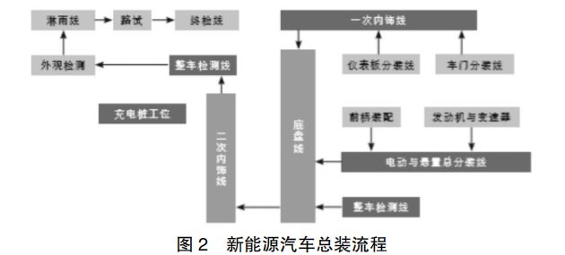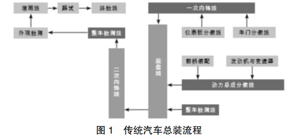 汽車總裝的含義是按照有關(guān)標(biāo)準(zhǔn),將汽車的各個(gè)零部件進(jìn)行合理的組裝和調(diào)配并最終形成完整汽車產(chǎn)品的過程。目前新能源汽車主要以純電動(dòng)汽車為主,因此,本文的新能源汽車主要指純電動(dòng)汽車。傳統(tǒng)汽車的總裝工藝主要包括裝配、檢測(cè)、路試、入庫(kù)、返修等環(huán)節(jié)。