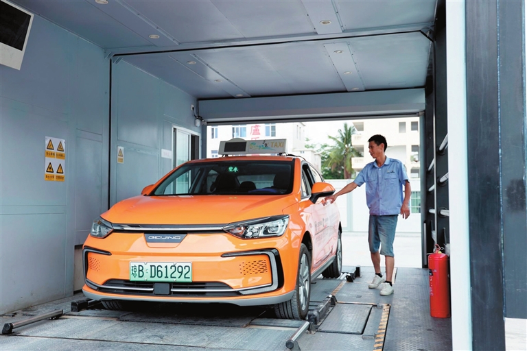 在南邊海新能源汽車換電站,出租車司機剛給車換完電。 記者 黃世烽 攝