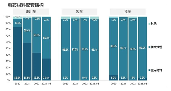 2023年1-6月, 乘用車(chē)領(lǐng)域,磷酸鐵鋰電芯配套率達(dá)65.2%,而商用車(chē)領(lǐng)域中基本已完成了對(duì)其他材料電芯的替代。