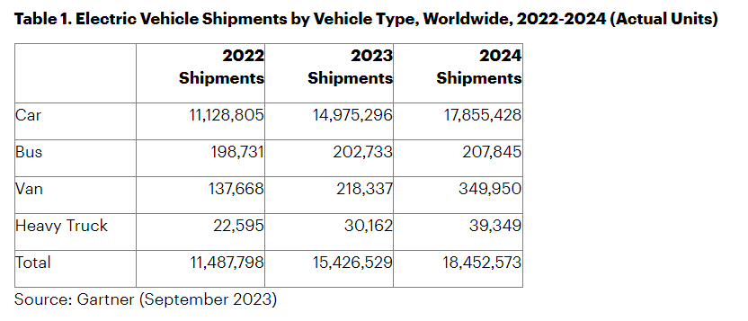 Gartner 表示如果計(jì)算汽車(chē)、巴士、貨車(chē)和重型卡車(chē)在內(nèi),所有電動(dòng)類(lèi)型的汽車(chē)出貨量為 1542 萬(wàn)輛;明年將達(dá)到 1845 萬(wàn)輛。