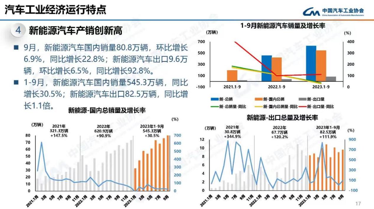 今年1月-9月,新能源汽車?yán)塾嫯a(chǎn)銷已經(jīng)達到631.3萬輛和627.8萬輛,同比分別增長33.7%和37.5%,市場占有率達29.8%。而前三季度,新能源汽車國內(nèi)銷量545.3萬輛,同比增長30.5%;出口量為82.5萬輛,同比增長1.1倍。