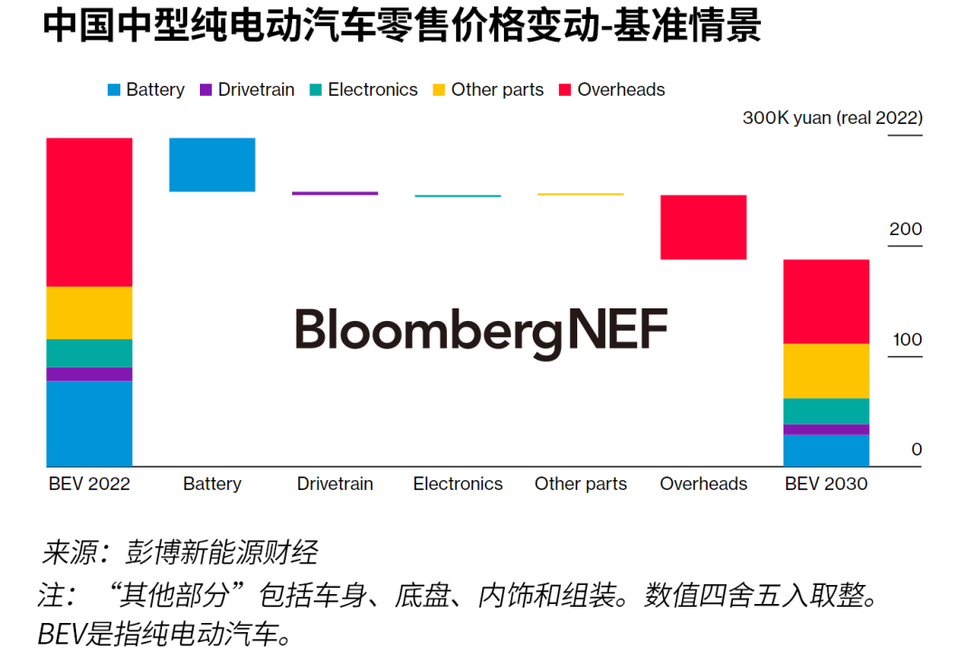 降低成本對新能源車企至關(guān)重要,因?yàn)榇蠖鄶?shù)車企尚未從新能源汽車的銷售中獲利。彭博新能源財經(jīng)估計,從2022年到2030年底,電池價格下跌以及轉(zhuǎn)用專用平臺可能會使中國純電動汽車價格下降40%。結(jié)合其他零部件和系統(tǒng)的改進(jìn),這可能會推動純電動汽車在2027年至2029年間實(shí)現(xiàn)燃油車平價。更廉價的電池、平臺協(xié)同效應(yīng)和產(chǎn)業(yè)價值鏈整合也是大眾汽車和比亞迪等公司成本降低路線圖的核心。