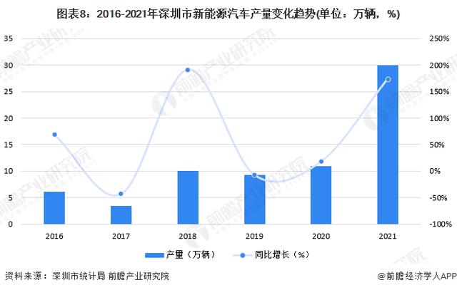近年來,深圳市新能源汽車產(chǎn)業(yè)發(fā)展迅猛。2018-2020年,深圳市新能源汽車產(chǎn)量維持在9萬輛/年以上,2020年突破了10萬輛;2021年,深圳市新能源汽車產(chǎn)量逼近30萬輛,同比增長174%;同時,在新能源汽車的有效推廣下,全市公交出租均已實現(xiàn)電動化,2021年全市新能源汽車銷量14.48萬輛,占當(dāng)年汽車銷量比重超40%。