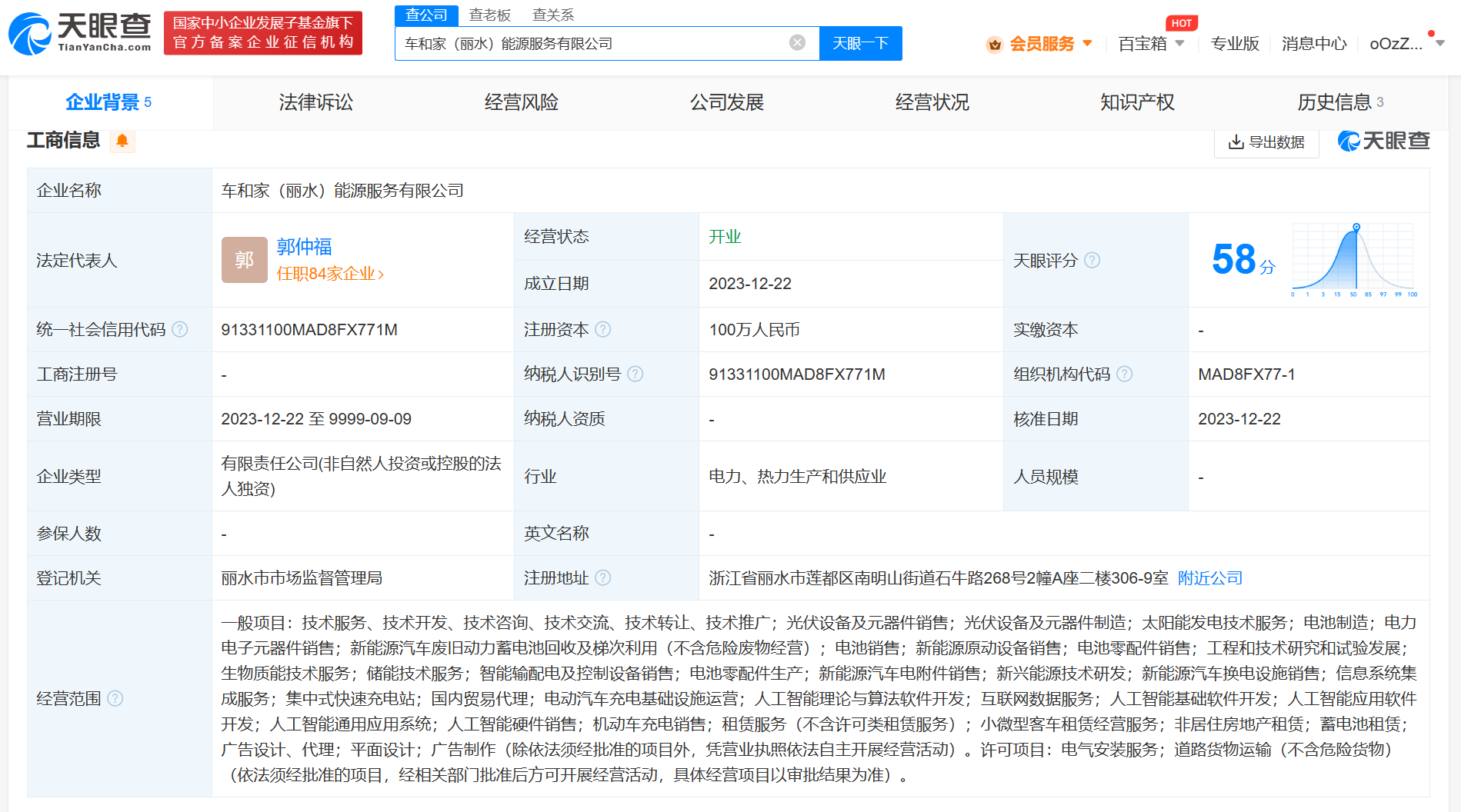 近日,車和家(麗水)能源服務(wù)有限公司成立,法定代表人為郭仲福,注冊(cè)資本100萬(wàn)人民幣,經(jīng)營(yíng)范圍含光伏設(shè)備及元器件制造、電池制造、電力電子元器件銷售、電池零配件生產(chǎn)、人工智能應(yīng)用軟件開發(fā)、小微型客車租賃經(jīng)營(yíng)服務(wù)等。股東信息顯示,該公司由理想汽車旗下北京車和家能源服務(wù)有限公司全資持股。