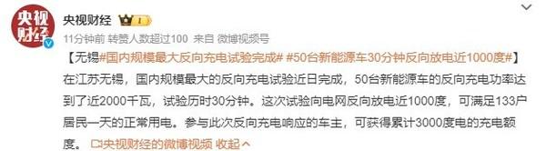 1月5日,據(jù)央視報道,近日在江蘇無錫,國內(nèi)規(guī)模最大的反向充電試驗完成,50臺新能源車的反向充電功率達(dá)到了近2000千瓦,試驗歷時30分鐘。這次試驗向電網(wǎng)反向放電近1000度,可滿足133戶居民一天的正常用電。參與此次反向充電響應(yīng)的車主,可獲得累計3000度電的充電額度。