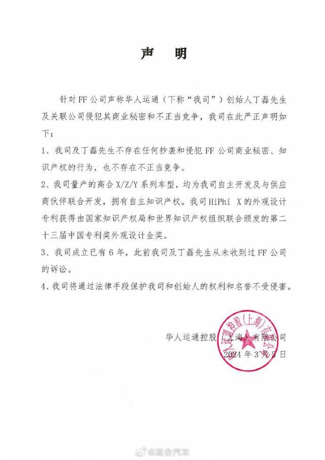 3月5日,就Faraday Future(法拉第未來(lái),以下簡(jiǎn)稱(chēng)“FF汽車(chē)”)對(duì)華人運(yùn)通高合汽車(chē)創(chuàng)始人丁磊及關(guān)聯(lián)公司的起訴,高合汽車(chē)方面發(fā)布聲明稱(chēng),該司及丁磊不存在任何抄襲和侵犯FF公司商業(yè)秘密、知識(shí)產(chǎn)權(quán)的行為,也不存在不正當(dāng)競(jìng)爭(zhēng)。