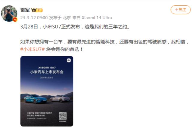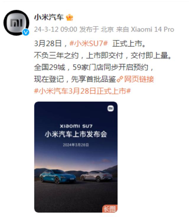 3月12日,雷軍發(fā)布微博稱,“3月28日,小米SU7正式發(fā)布,這是我們的三年之約。”小米汽車官方微博同時(shí)宣布小米SU7將于3月28日正式上市并交付,并在全國59家門店同步開啟預(yù)約。