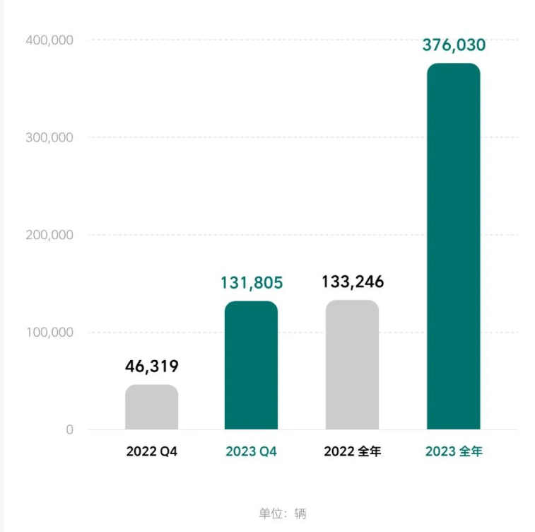理想汽車扭虧為盈的背后是交付量的強勁增長。2023年,理想汽車交付新車37.6萬輛,同比增長182.2%,超額完成年度30萬輛的交付目標(biāo),奪得2023年新勢力“銷冠”。其中,四季度交付13.18萬輛,同比增長184.6%,超此前交付指引。
