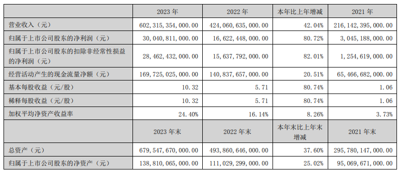 3月26日晚,比亞迪披露2023年年報。報告期內(nèi),比亞迪實現(xiàn)營業(yè)收入6023.15億元,同比增長42.04%;實現(xiàn)歸母凈利潤300.41億元,同比增長80.72%,經(jīng)營性現(xiàn)金流凈額1697.25億元,均創(chuàng)歷史新高。
