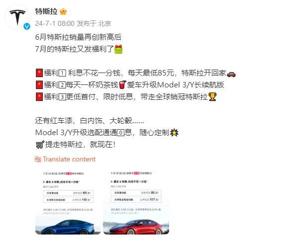 7月31日前,針對Model 3/Y標(biāo)準(zhǔn)續(xù)航版推出的1~5年0息和低息優(yōu)惠購車政策,日供低至85元起;針對Model 3/Y長續(xù)航全輪驅(qū)動版推出的1~5年0息和低息購車優(yōu)惠政策,日供低至107元起;特斯拉將7月限時低息的年費率降至0.5%起(折合年化利率0.93%起)。