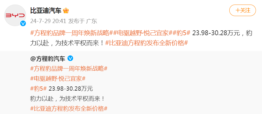 7月29日晚間,比亞迪旗下方程豹宣布品牌一周年煥新戰(zhàn)略,“豹5”車型上線全新價(jià)格,售價(jià)區(qū)間現(xiàn)為23.98萬元—30.28萬元。