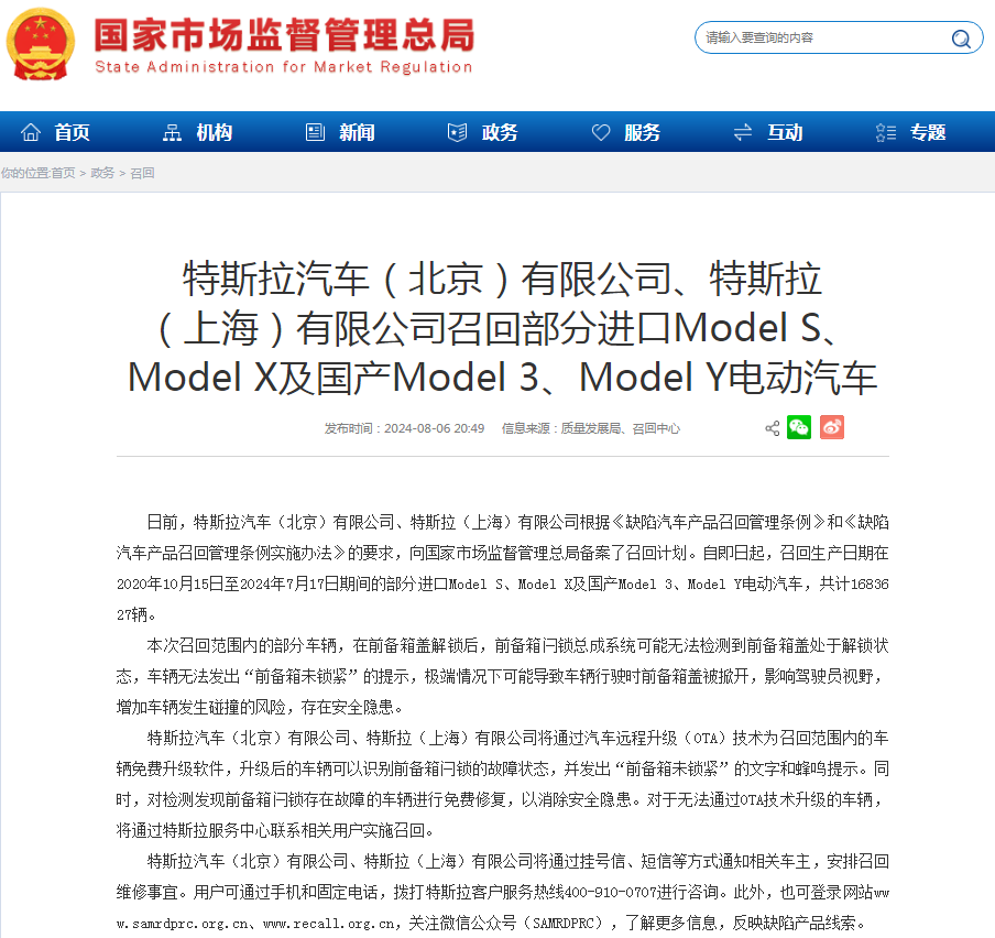 據(jù)市場監(jiān)管總局6日消息,特斯拉汽車(北京)有限公司、特斯拉(上海)有限公司根據(jù)《缺陷汽車產(chǎn)品召回管理條例》和《缺陷汽車產(chǎn)品召回管理條例實施辦法》的要求,近日向市場監(jiān)管總局備案了召回計劃:自即日起,召回生產(chǎn)日期在2020年10月15日至2024年7月17日期間的部分進口Model S、Model X及國產(chǎn)Model 3、Model Y電動汽車,共計1683627輛。