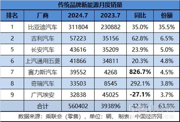 從前7個月的累計銷量來看,傳統(tǒng)新能源車企還是維持原有格局,入圍前十榜單的8家品牌的合計銷量超過333萬輛,同比增長39.7%,在新能源乘用車總銷量中的占比近七成。
