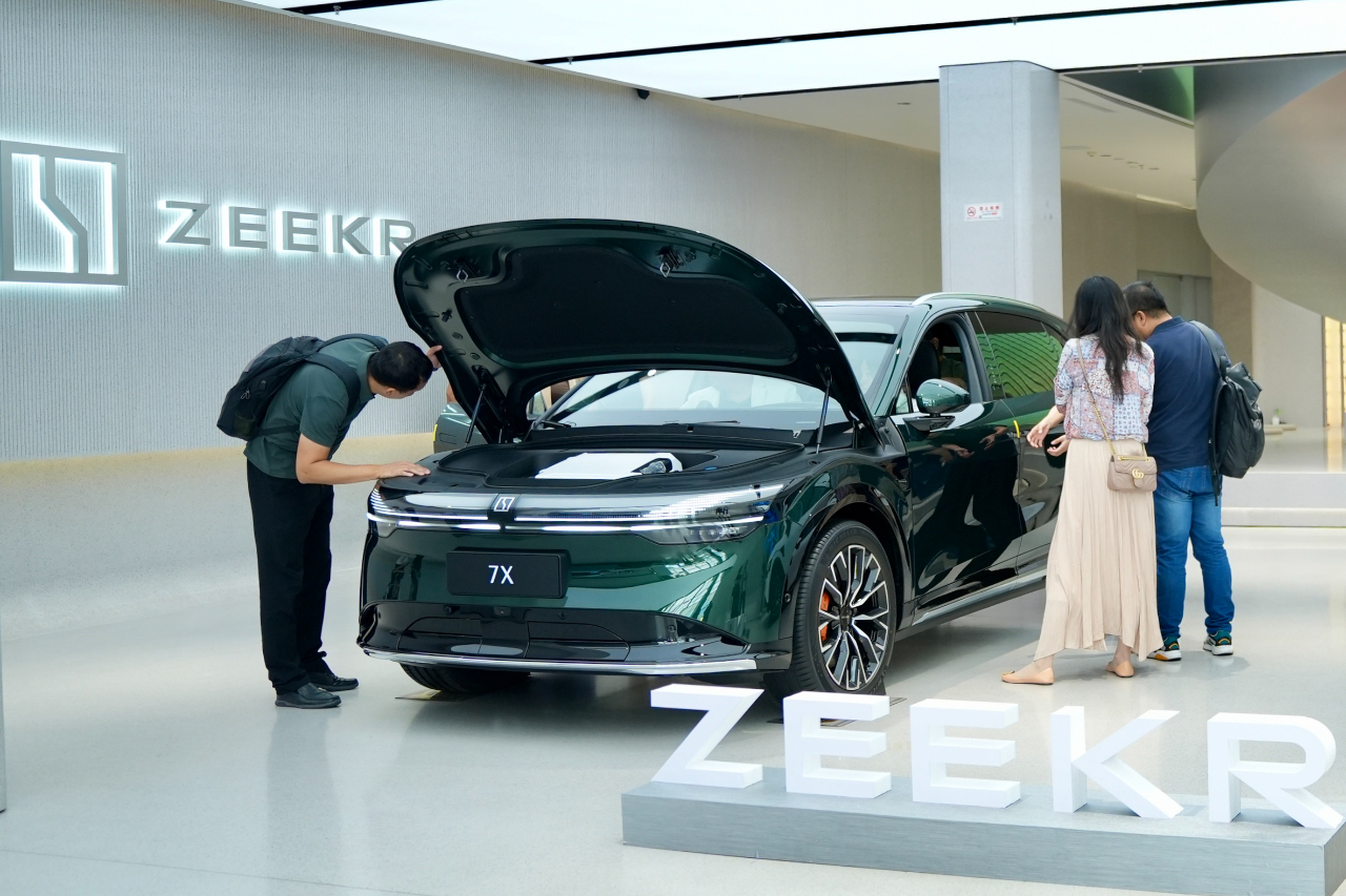 極氪7X純電SUV媒體品鑒會在北京舉行。圖為媒體記者查看該車外觀細節(jié)。(圖片由CNSPHOTO提供)