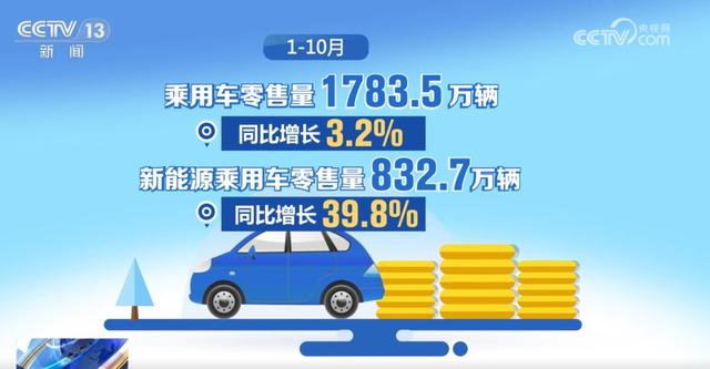 在以舊換新政策的帶動下,汽車銷量也有了明顯增長。10月份,乘用車零售量226.1萬輛,同比增長11.3%,增速較9月加快6.8個百分點。其中,新能源乘用車零售量119.6萬輛,同比增長56.7%,增速較9月加快5.8個百分點,占乘用車零售量的比重達52.9%。1—10月,乘用車零售量1783.5萬輛,同比增長3.2%。其中,新能源乘用車零售量832.7萬輛,同比增長39.8%。(央視網)