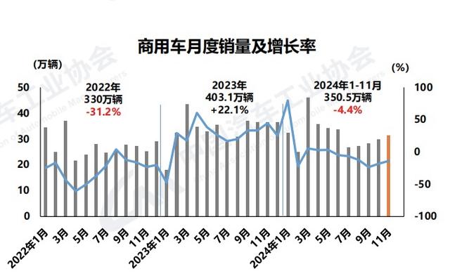 數(shù)據(jù)顯示,1~11月,商用車國內(nèi)銷量為267.9萬輛,同比下降9.9%;商用車出口量為82.6萬輛,同比增長19.3%。其中,11月,商用車國內(nèi)銷量24.4萬輛,同比下降15.8%;商用車出口7.1萬輛,同比下降6.6%。