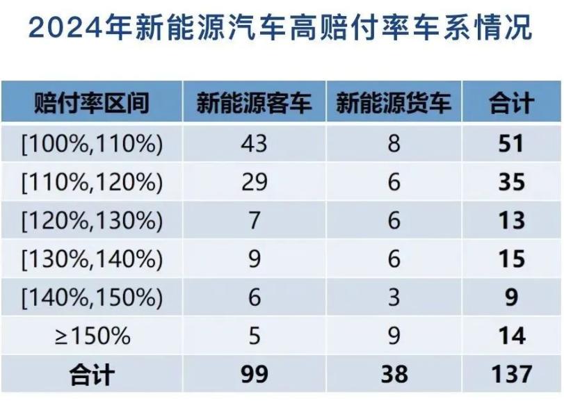承保的2795個車系中,賠付率超過100%(即虧損)的高賠付率車系有137個。其中,新能源客車共承保車系1654個,承保2982萬輛;承保車輛數(shù)超過1萬輛的車系301個,其中賠付率超過100%的車系有99個。新能源貨車共承保車系1141個,承保123萬輛;承保車輛數(shù)超過0.5萬輛的車系55個,其中賠付率超過100%的車系有38個。