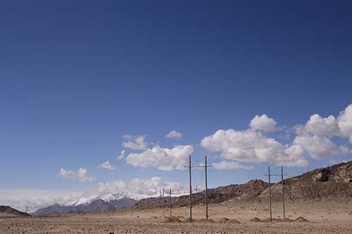 項目身處青海都蘭一望無際的戈壁灘,氣候干燥,風沙肆虐,寒風刺骨,自然條件十分惡劣,電話信號時有時無。春夏相接的五月,沙塵暴和冰雹更是常常輪番“光顧”施工現(xiàn)場,給施工進度和安全管理帶來不小的挑戰(zhàn)。對此,中國安能第二工程局青海風電項目部員工對工作沒有絲毫懈怠,大家精誠團結、眾志成城,施工生產穩(wěn)步推進。此次放線工作于5月28日在5#地塊正式開始,該區(qū)段包含146基鐵塔,放線長度37900米,109.8噸重的導線翻越山巒,在平均海拔3000米的荒漠戈壁攀行30天,最終于五標段2-G67號塔位進行交匯。