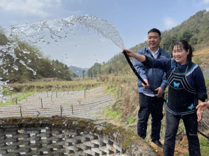 劉彬(左一)協(xié)調下瓦窯村生態(tài)農業(yè)項目實現(xiàn)了通電引水(貴陽供電局供圖)。