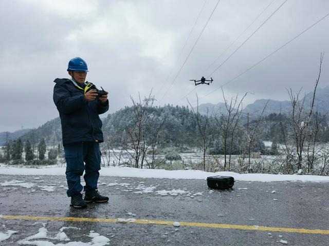 雪鵝毛般下得很大,一路上車很少,鄭鋒將車提前裝好防滑鏈后一直保持不超過30碼的車速小心行駛,到達110千伏黃牽線40號塔附近,室外氣溫已達-5度,迎著刮臉刺骨的風(fēng),4人向塔所在的山腰挺進。一時間雪下小了,短暫的“空窗期”給了他們飛無人機的絕佳機會。