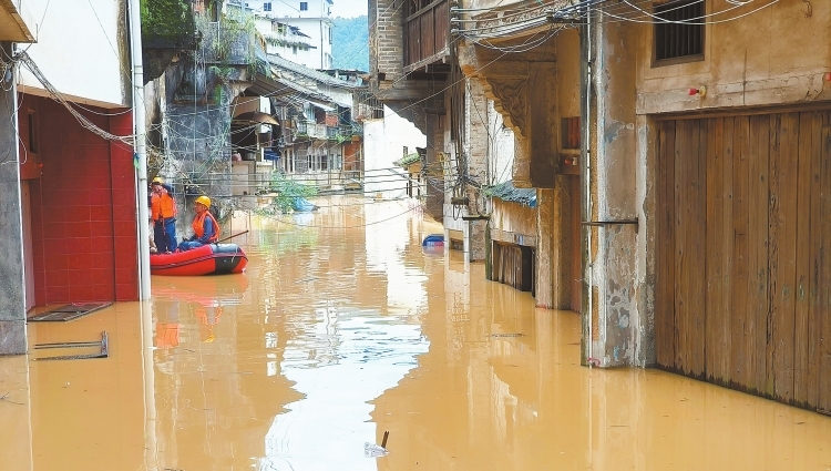 6月17日,廣東電網(wǎng)公司梅州大埔供電局員工乘船對水浸區(qū)域進行巡視。 李旺 攝