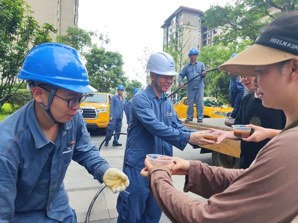6月22日,桂林市萬達(dá)翰林府小區(qū)群眾為正在開展搶修復(fù)電的南方電網(wǎng)廣西欽州靈山供電局黨員突擊隊(duì)員們送上綠豆湯。陳心誠(chéng)攝