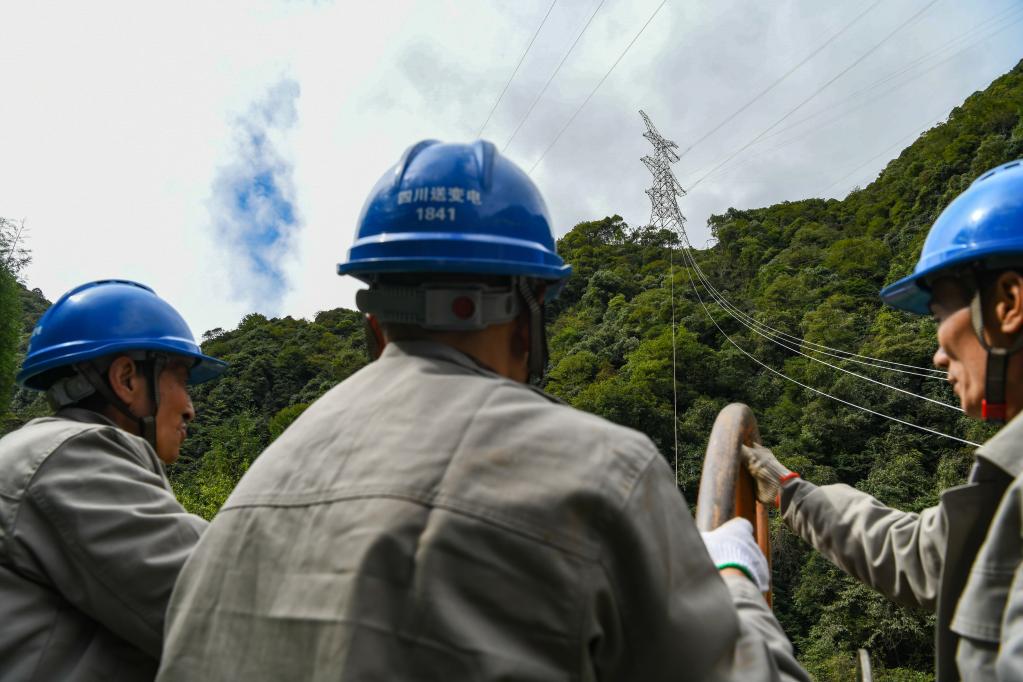 10月18日,在四川省雅安市天全縣喇叭河鎮(zhèn),技術人員在操作駐架車回卷三級導引繩。新華社記者 王曦 攝
