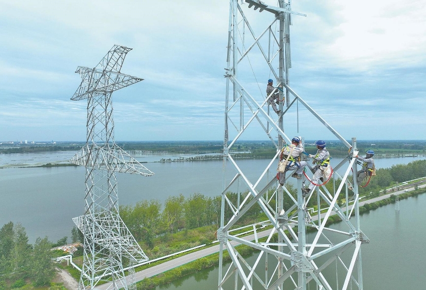 從安徽淮南一路向西北越過(guò)淮河,在淮南市潘集區(qū)的一片水面附近,亳二—平圩“π”入潘集變電站500千伏線路工程建設(shè)有序開展。7月19日,安徽送變電工程有限公司10名作業(yè)人員正在水面上組立該工程的一基鐵塔。
