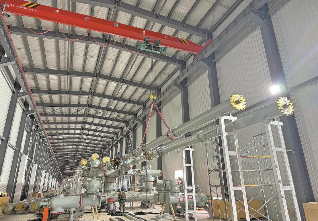 8月26日,施工人員在丁字口變電站330千伏戶內氣體絕緣全封閉組合電器廠房內對接母線筒。 劉博博 攝
