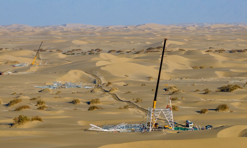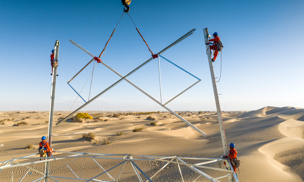 近日,山東送變電工程有限公司施工人員開展新疆750千伏且末—若羌輸電線路工程Ⅱ標(biāo)段鐵塔組立作業(yè)。該標(biāo)段線路長(zhǎng)110.85千米,全線位于塔克拉瑪干沙漠,共計(jì)新建鐵塔225基。