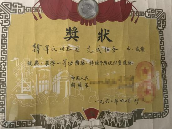 1962年9月,韓澤民榮立一等功的獎狀