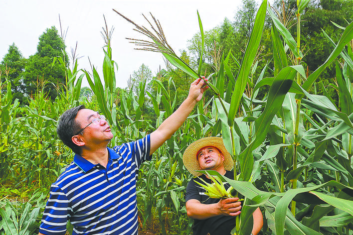 黃丹松(左)查看村民受到風(fēng)災(zāi)的玉米地。