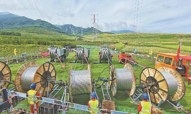 日月山—杜鵑雙回線路工程導(dǎo)線展放作業(yè)現(xiàn)場。鄒建華 攝