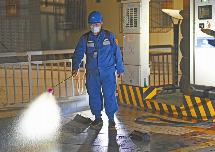 從2月2日晚上開(kāi)始,廣西電網(wǎng)公司南寧邕寧供電局黨員服務(wù)隊(duì)每天組織3名黨員,在23時(shí)后對(duì)供電區(qū)域內(nèi)的電動(dòng)汽車(chē)充電站進(jìn)行全面消毒,減少對(duì)用戶(hù)的影響,確保充電環(huán)境安全。馬華斌 攝