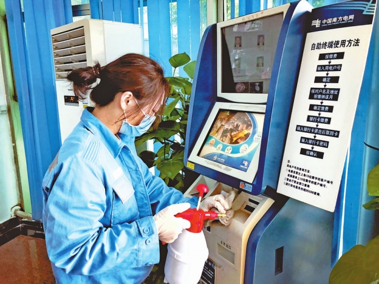 連日來(lái),廣東電網(wǎng)公司江門(mén)臺(tái)山供電局組織員工對(duì)營(yíng)業(yè)廳、辦公場(chǎng)所和車(chē)輛進(jìn)行全面清潔消毒,做好防疫后勤保障工作。謝錕 攝
