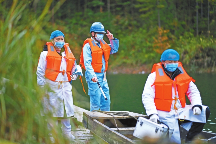 2月8日,在臺(tái)江縣革一鎮(zhèn)排生村,臺(tái)江供電局臺(tái)盤(pán)供電所黨員王清亮和當(dāng)?shù)匦l(wèi)生部門(mén)工作人員乘船前往工作點(diǎn)。 劉開(kāi)福 攝影報(bào)道