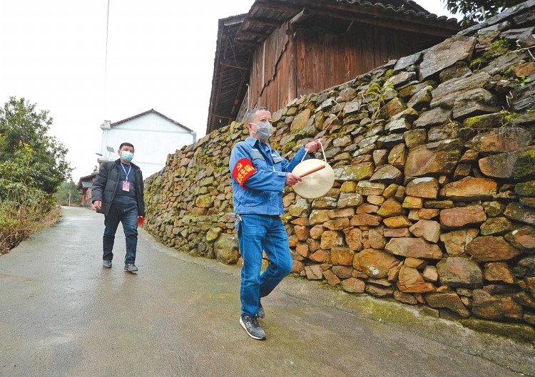 2月5日,貴州省黔東南苗族侗族自治州三穗縣八弓鎮(zhèn)高寨村響洞寨,貴州電網(wǎng)公司凱里三穗供電局駐高寨村幫扶干部羅德杰(右一)和村委干部一同,一個(gè)負(fù)責(zé)敲鑼?zhuān)粋€(gè)負(fù)責(zé)提著播放器,穿梭于寨子里,向村民宣傳防疫知識(shí)。 萬(wàn)明忠 攝