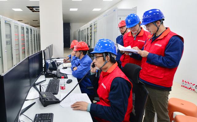 國(guó)網(wǎng)天津?yàn)I海供電公司員工在南港乙烯220千伏變電站進(jìn)行送電前的準(zhǔn)備。
