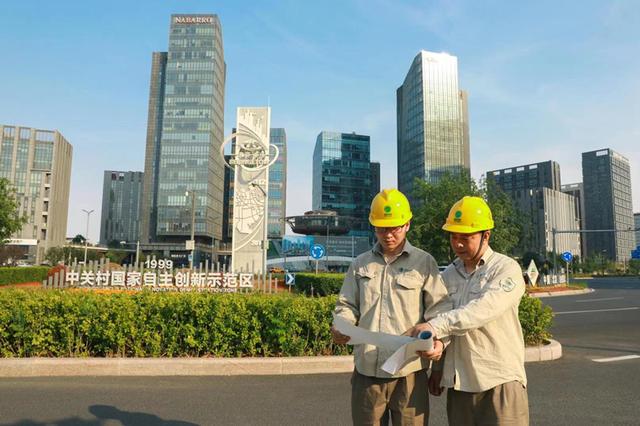國(guó)網(wǎng)北京亦莊供電公司員工在北京經(jīng)開(kāi)區(qū)中關(guān)村國(guó)家自主創(chuàng)新示范區(qū)巡檢重點(diǎn)線路,保障高溫天氣下電網(wǎng)運(yùn)行平穩(wěn)。